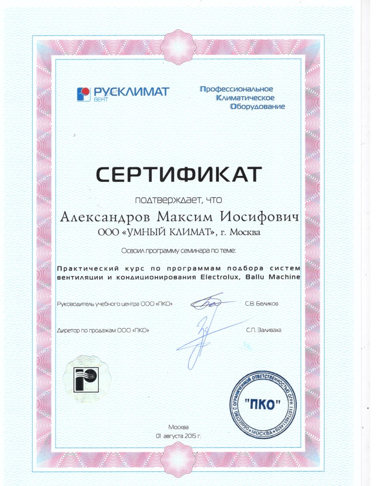 - Сертификат, подтверждающий освоение программы семинара Александровым М. И. ООО «Умный климат»