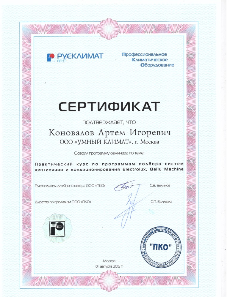 - Сертификат, подтверждающий освоение программы семинара Коноваловым А. И. ООО «Умный климат»