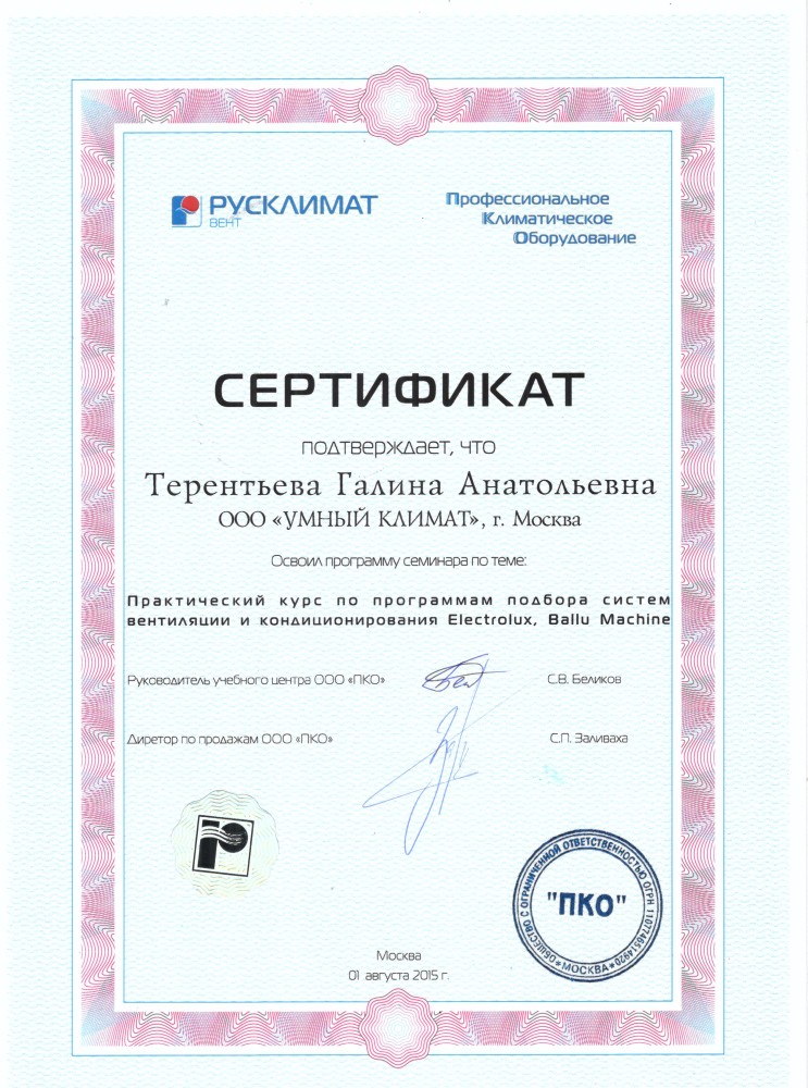 - Сертификат, подтверждающий освоение программы семинара Терентьевой Г. А. ООО «Умный климат»