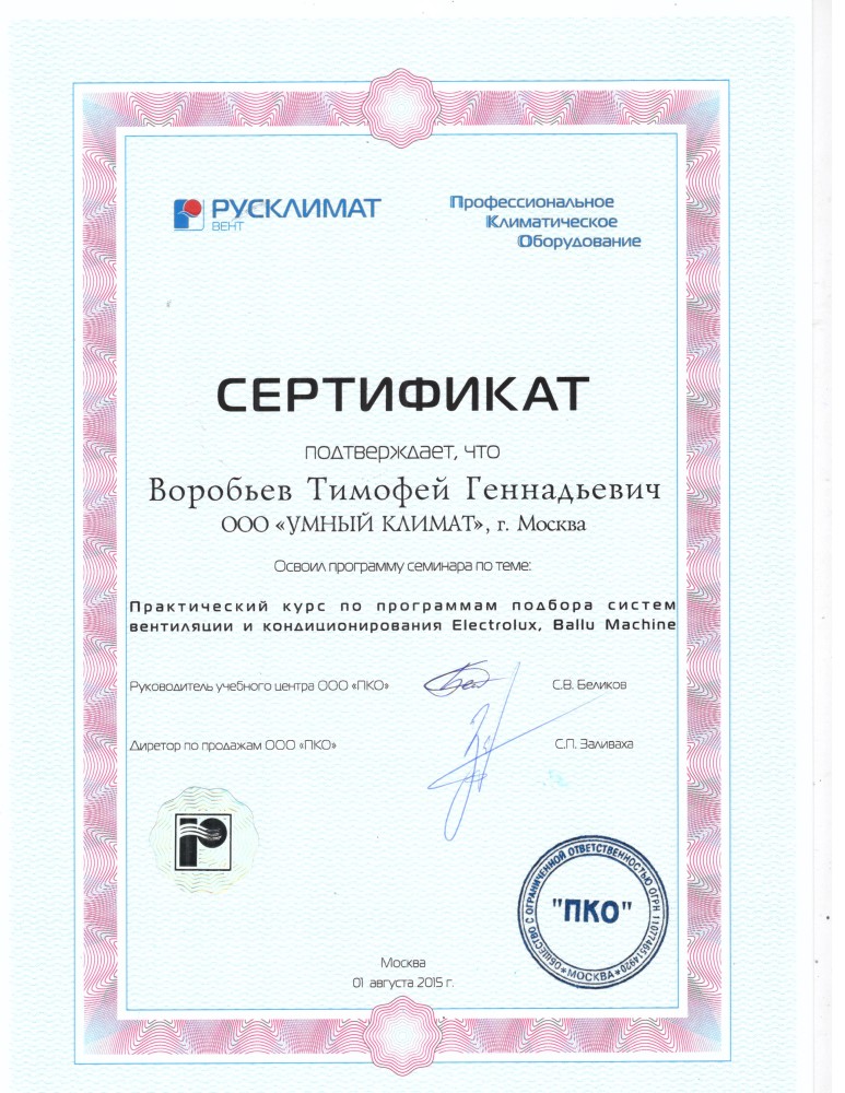 - Сертификат, подтверждающий освоение программы семинара Воробьевым Т. Г. ООО «Умный климат»