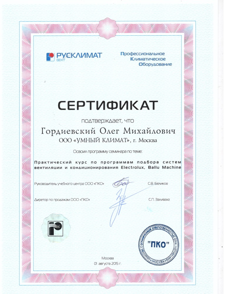 - Сертификат, подтверждающий освоение программы семинара Гордиевским О. М. ООО «Умный климат»