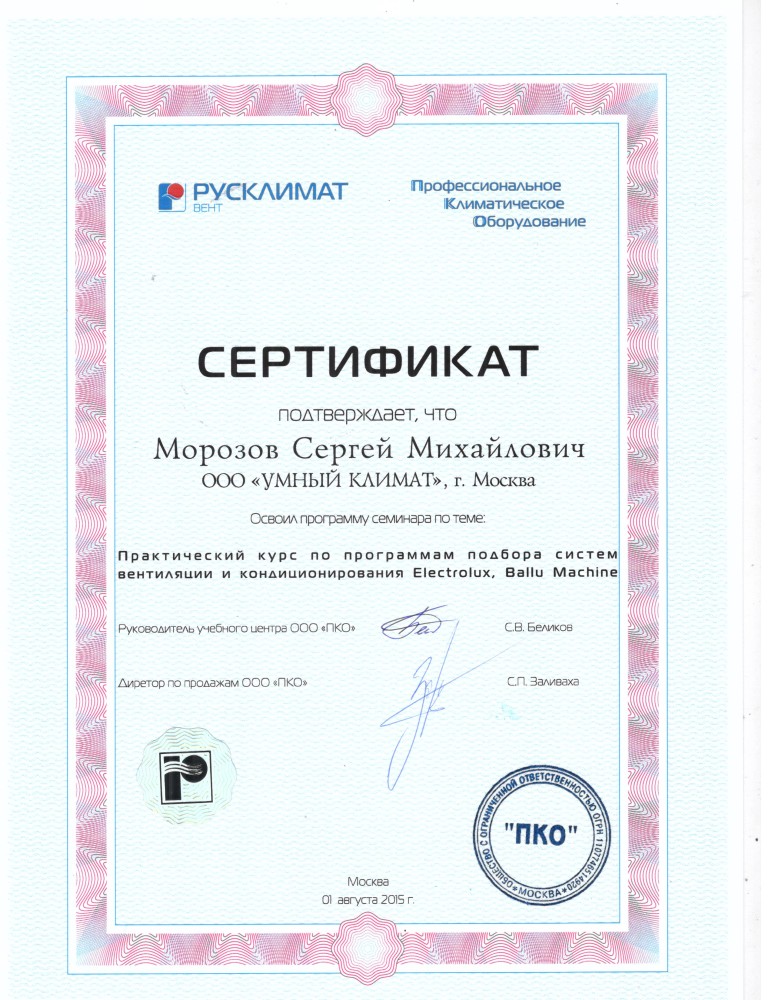 - Сертификат, подтверждающий освоение программы семинара Морозовым С. М. ООО «Умный климат»