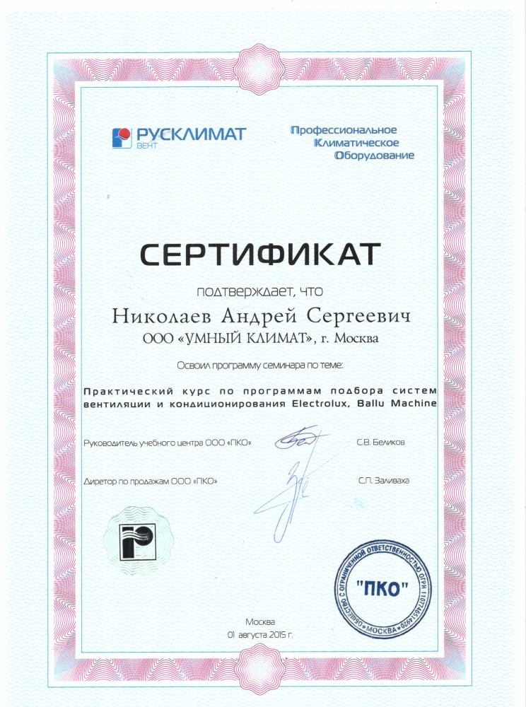 - Сертификат, подтверждающий освоение программы семинара Николаевым А. С. ООО «Умный климат»