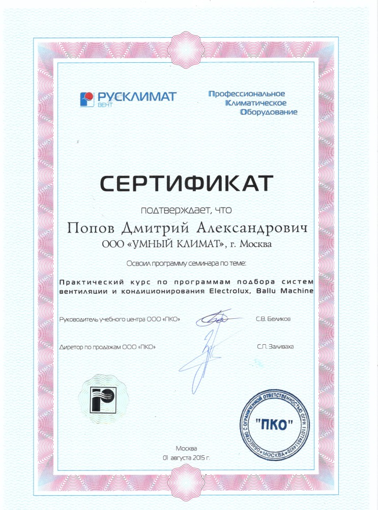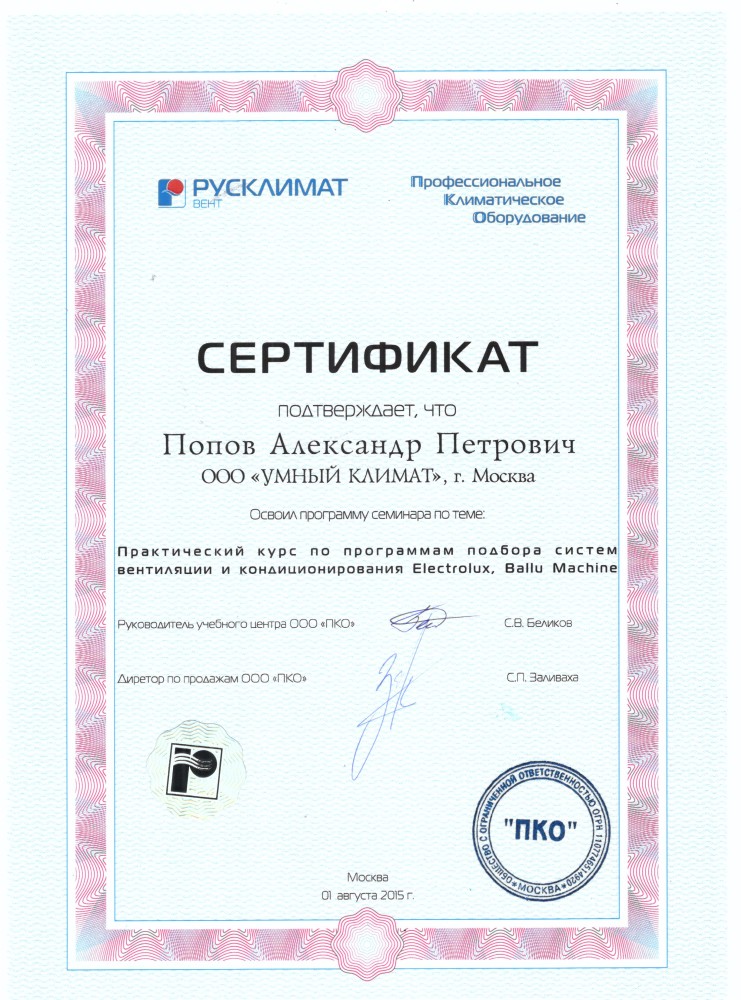 - Сертификат, подтверждающий освоение программы семинара Поповым А. П. ООО «Умный климат»