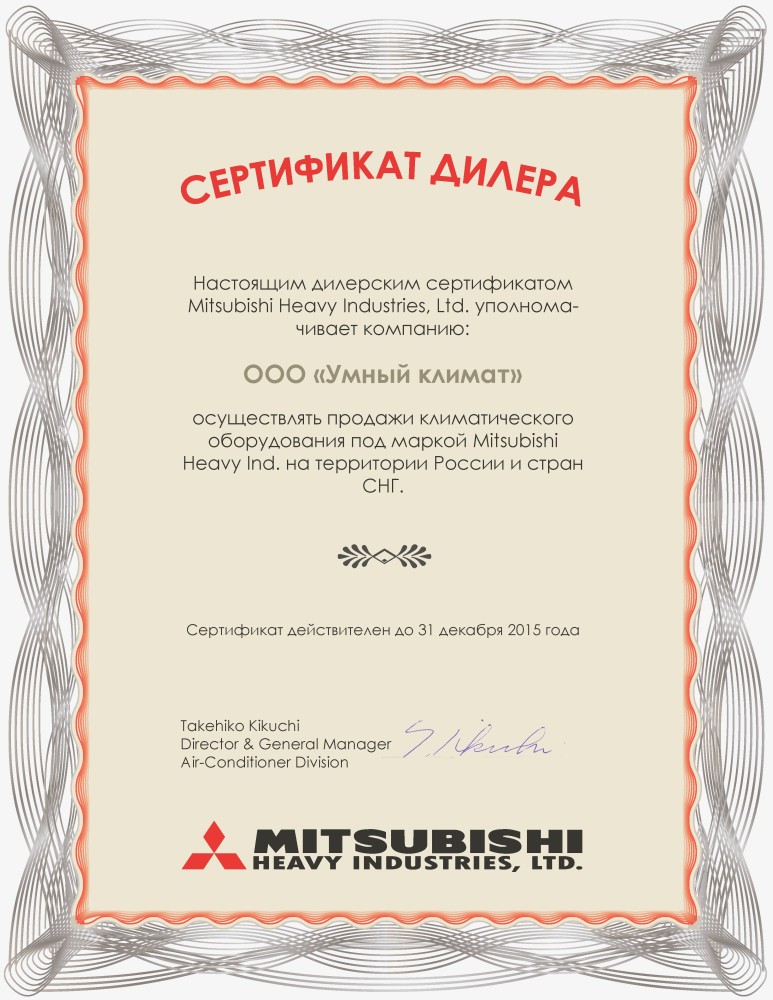 - Сертификат официального дилера Mitsubishi Heavy 2015