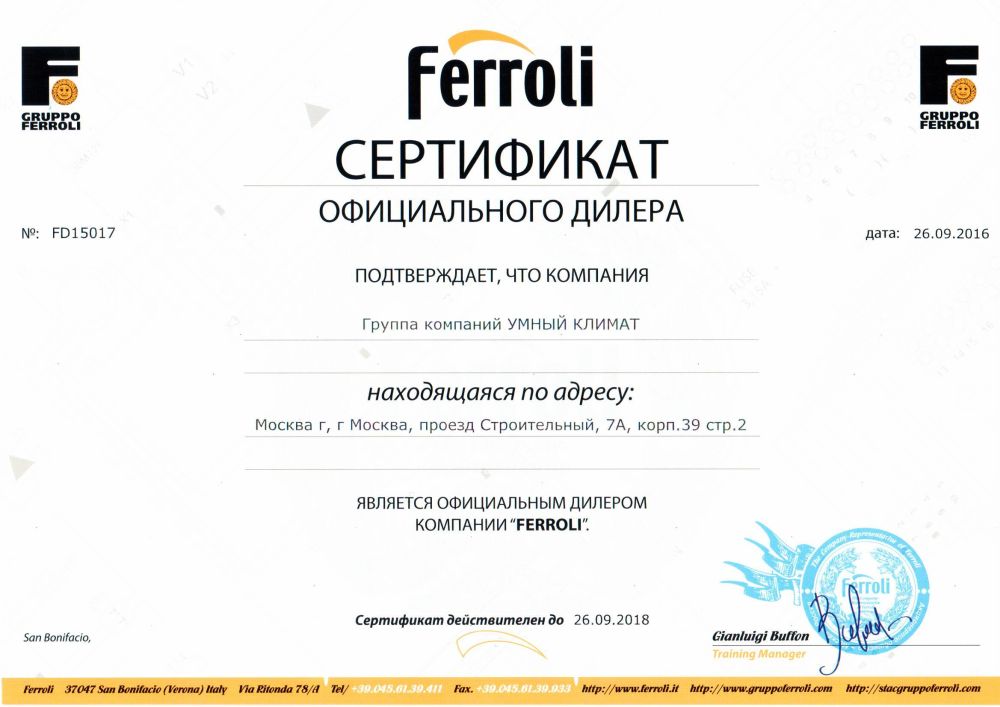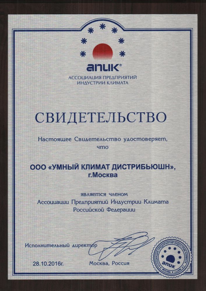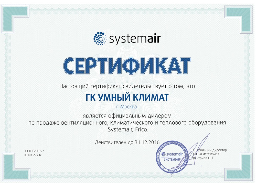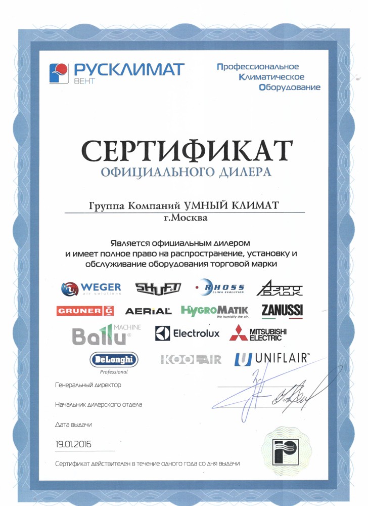 - Сертификат официального дилера Weger, Rhoss, Аэроблок, Gruner, Aerial, HygroMatic, Zanussi,Ballu Machine, Electrolux, Mitsubishi Electric, DeLonghi, Koolair, Uniflair 2016