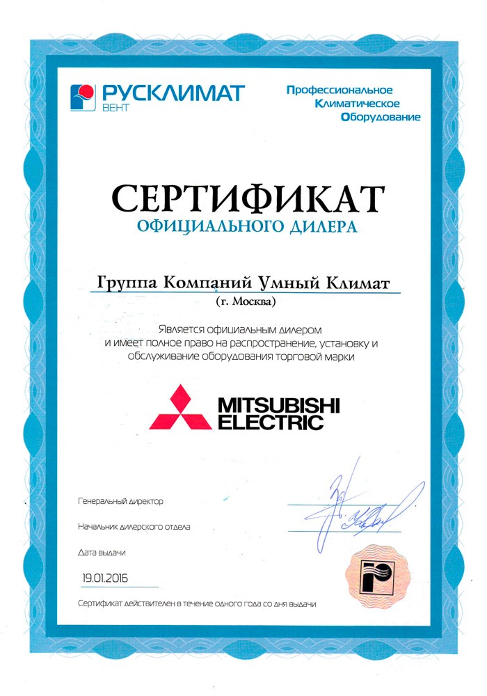 - Сертификат официального дилера Mitsubishi Electric 2016