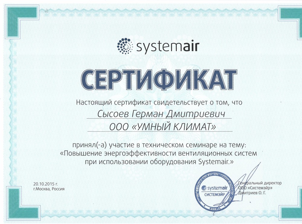 - Сертификат об участии Сысоева Г. Д. ООО «Умный климат» в тех. семинаре Systemair