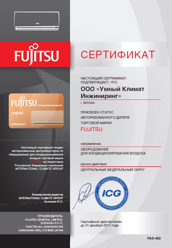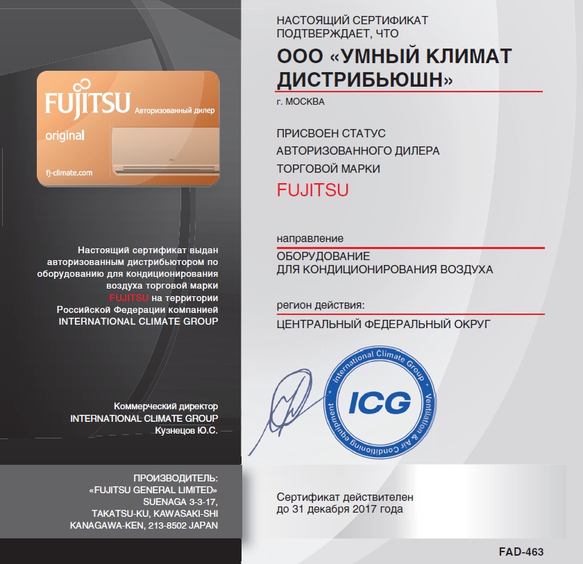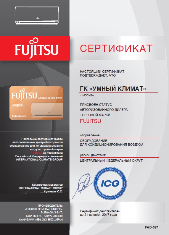 - Сертификат ГК «Умный климат» авторизованного дилера Fujitsu 2017
