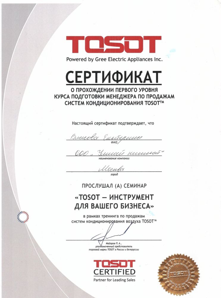 - Сертификат об участии в семинаре Tosot Власовой Е. ООО «Умный климат»