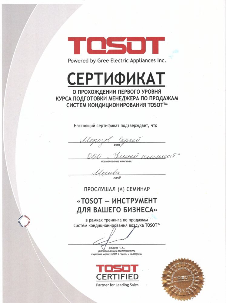 - Сертификат об участии в семинаре Tosot Морозова С. ООО «Умный климат»