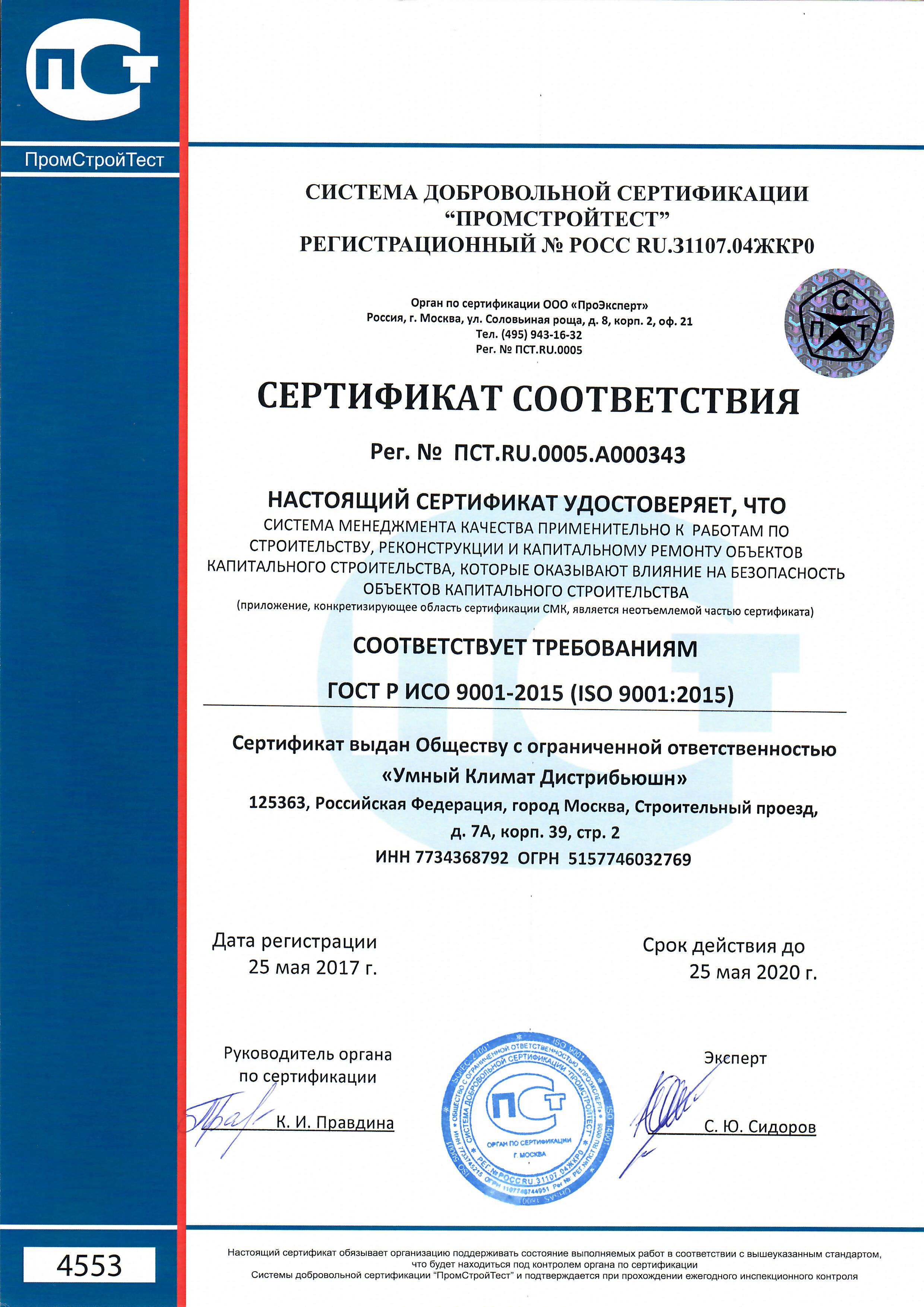 - Сертификат, подтверждающий освоение программы семинара Сафоновым В. В. ООО «Умный климат»