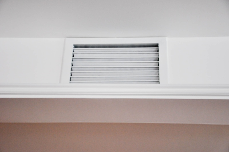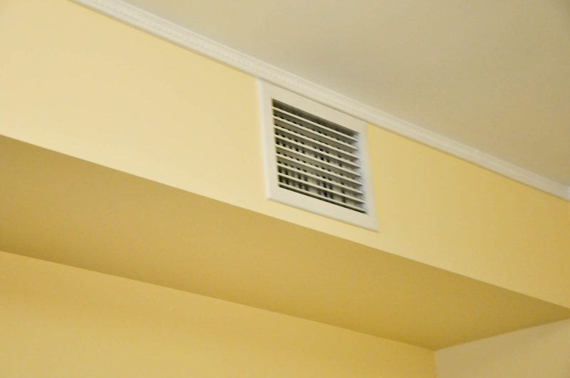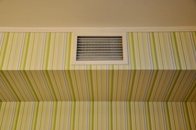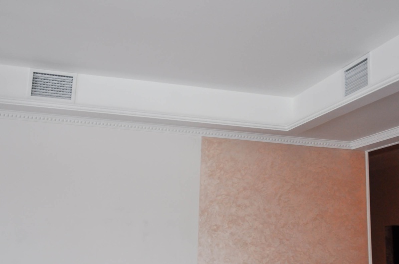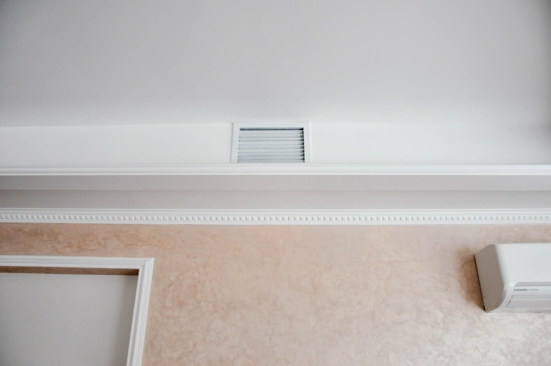 Установка была смонтирована в специальную нишу в лоджии, воздуховоды скрыты в фальш-балках, снаружи видны только распределительные решетки, которые можно регулировать при помощи клапанов.