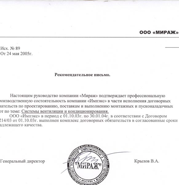 Настоящим руководство компании «Мираж» подтверждает профессиональную рпоизводственную состоятельность компании «Импэкс» в части исполнения договорных обязательств по проектированию, поставкам и выполнению монтажных и пусконаладочных работ по теме: Системы вентиляции и кондиционирования.