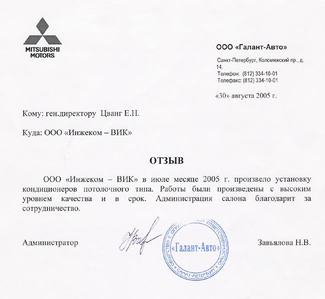 ООО «Инжеком - ВИК» в июле месяце 2005 г. произвело установку кондиционеров потолочного типа. Работы были произведены с высоким уровнем качества и в срок. Администрация салона благодарит за сотрудничество.