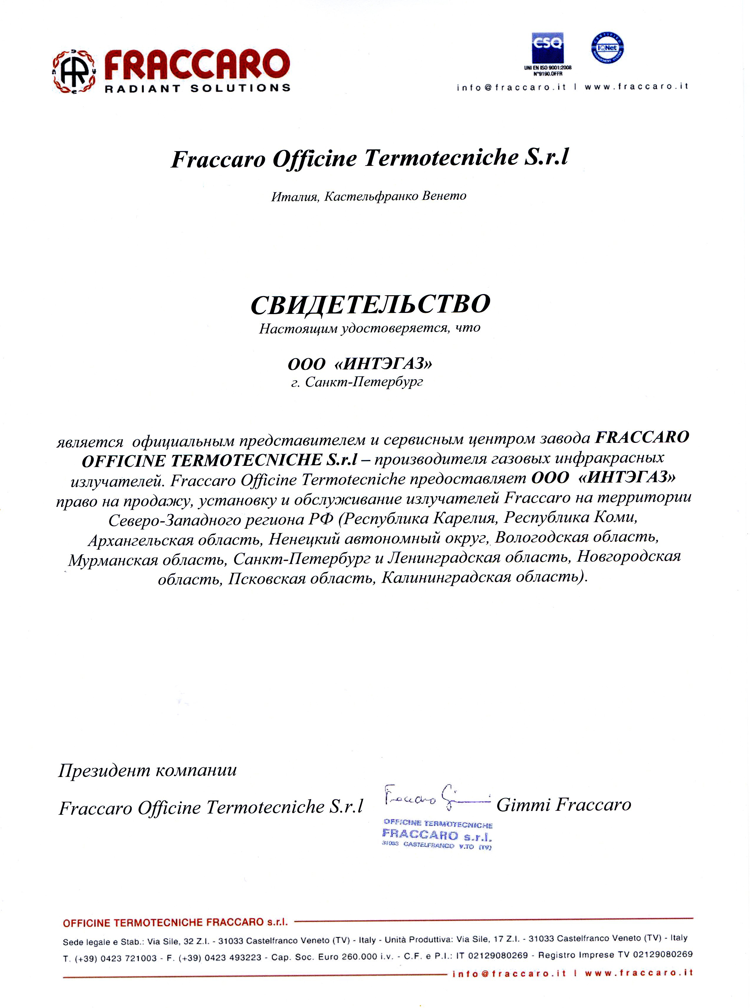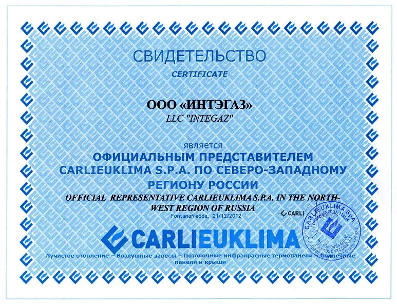 Сертификат официального представителя Carlieuklima в Северо-Западном регионе