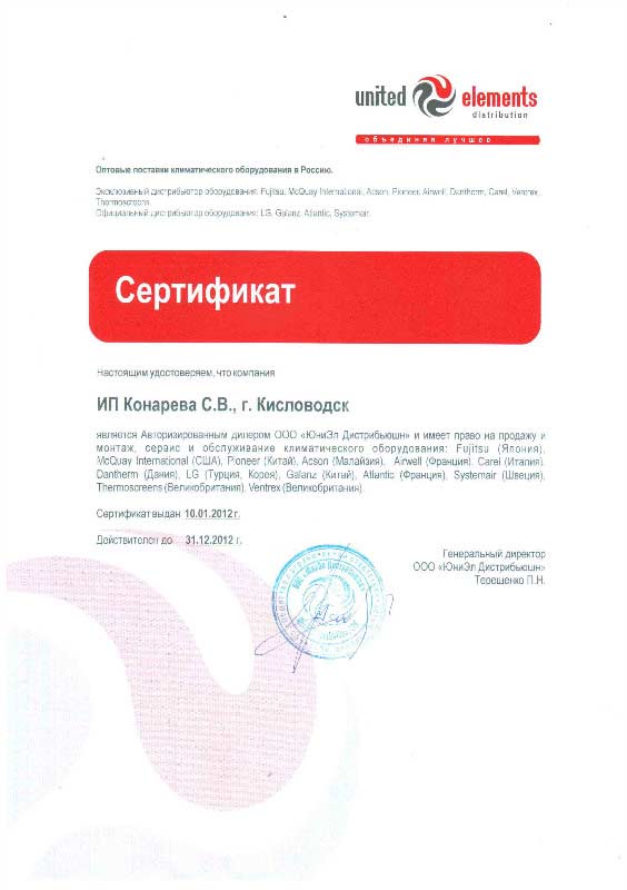 Сертификат авторизованного дилера компании "Юнайтед Элементс"