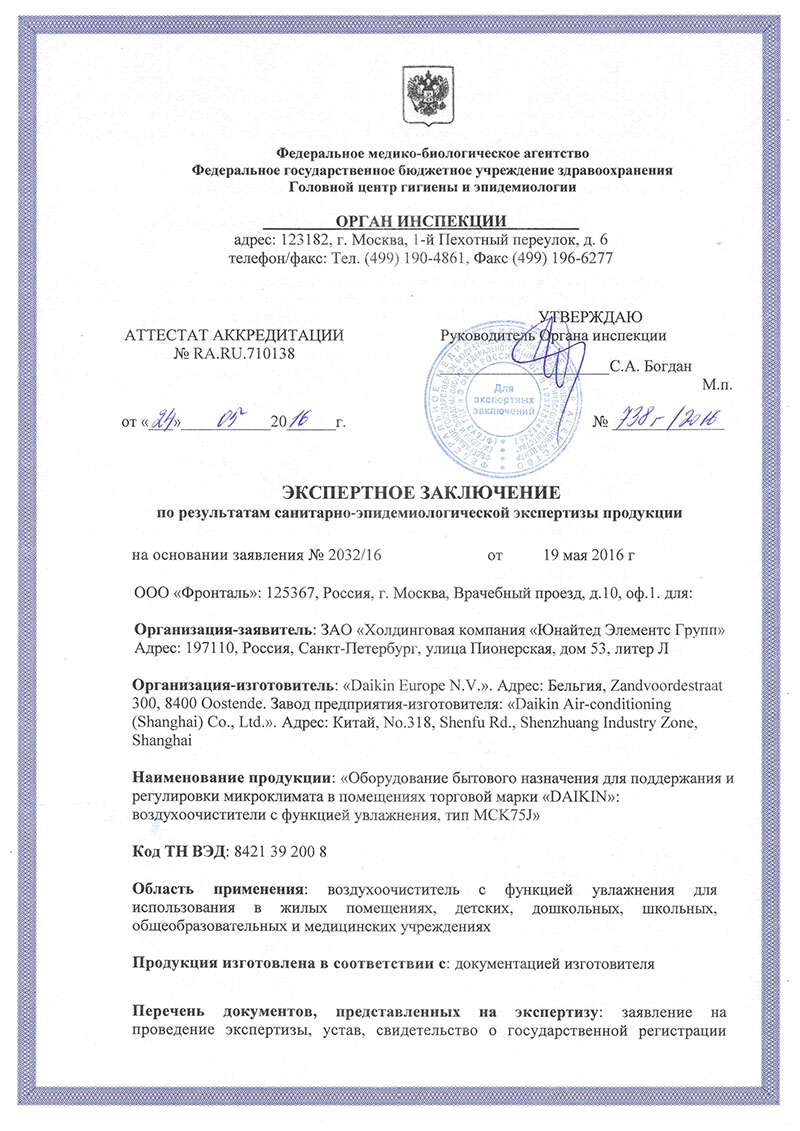 Воздухоочиститель Daikin MCK75J получил так называемый «медицинский» сертификатЭкспертное заключение подтверждает, что данный воздухоочиститель может применяться в медицинских учреждениях, а также в детских, дошкольных, школьных, общеобразовательных.