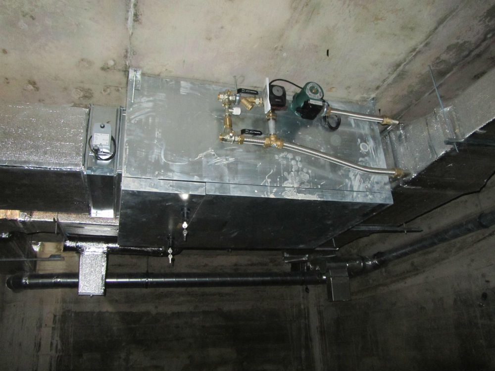 Приточная установка оснащена фильтром для очистки воздуха от пыли, водяным воздухонагревателем, вентилятором и секцией шумоглушения.