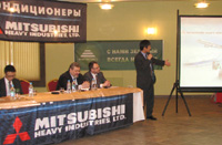 Деловая часть конференции продолжилась презентацией новых моделей оборудования. Так, в частности, господин Такехико Кикучи представил российским партнерам новейшие модели тепловых насосов для промышленного применения, а также представил обновленную структуру корпорации MHI. В 2011 году корпорация планирует начать поставки в Россию всемирно известной линейки центробежных чиллеров MHI, имеющих самый высокий коэффициент энергоэффективности в отрасли.