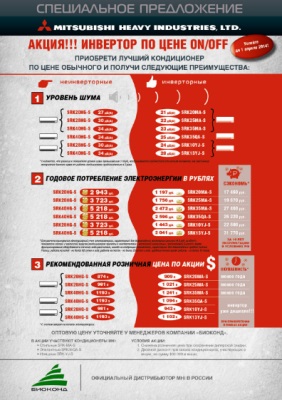Корпорация Mitsubishi Heavy Industries, Ltd. и ее российский дистрибьютор – компания «БИОКОНД», запустили акцию «Инвертор по цене кондиционера on/off». Впервые на отдельные серии инверторных кондиционеров MHI оптовая цена ниже оптовой цены на неинверторные (on/off) модели.