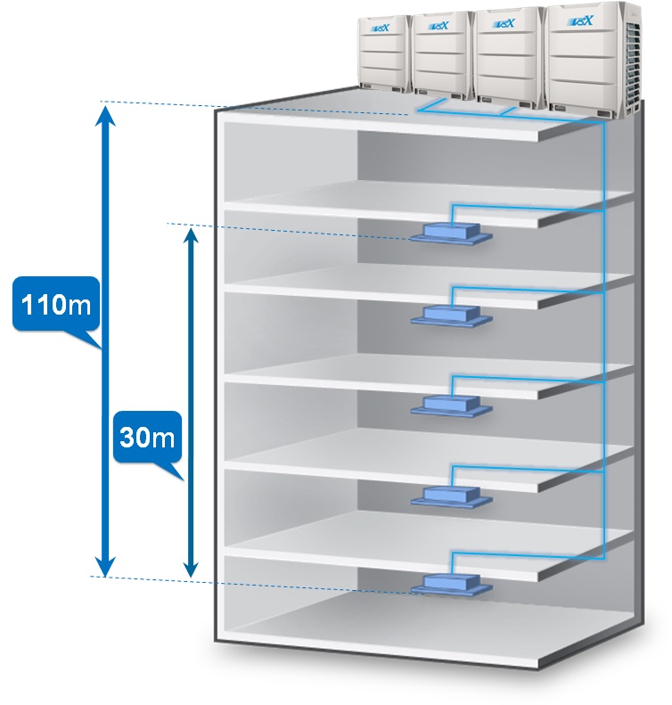 • перепад высоты между наружным блоком и внутренними при условии, что наружный блок находится ниже внутренних – 110 м.