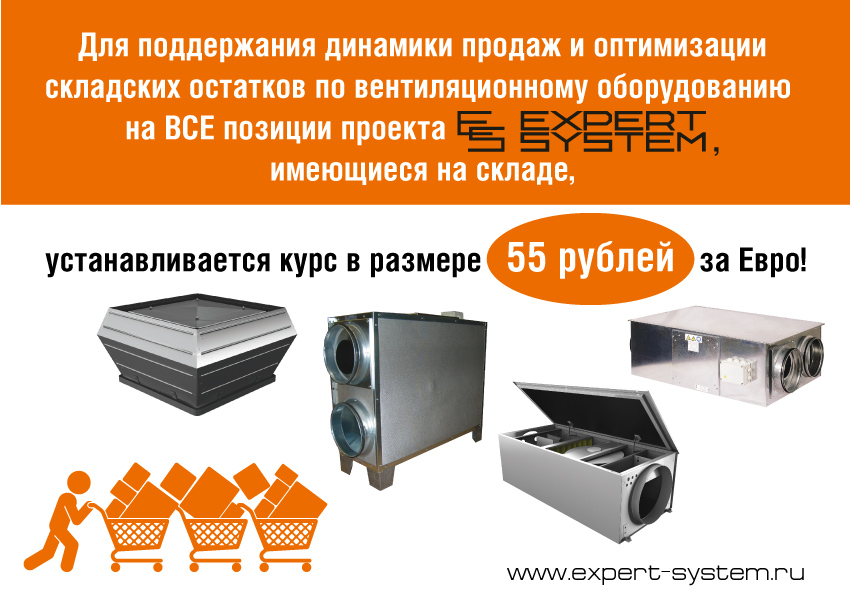 На вентиляционные установки UTEK, вентиляторы Rosenberg, сетевые элементы Expert System установлен курс 55 рублей за евро. Наименование моделей и количество оборудования, имеющегося на складе, уточняйте у вашего персонального менеджера в компании-дистрибьюторе.