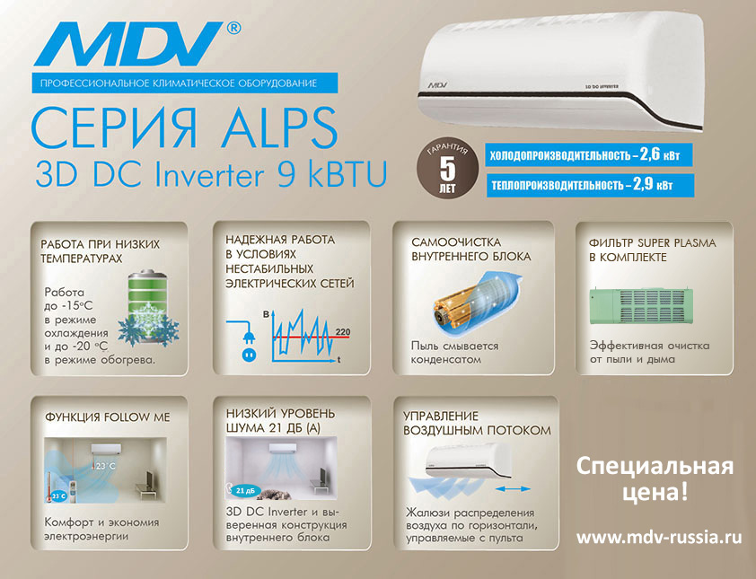 Полностью инверторная сплит-система MDV серии ALPS обладает высоким уровнем надежности, что подтверждает пятилетняя гарантия производителя. В основе системы лежит технология 3D-inverter: инверторным является не только компрессор наружного блока, но и моторы вентиляторов наружного и внутреннего блоков. Благодаря применению этой технологии уровень энергоэффективности системы достигает класса «А+».