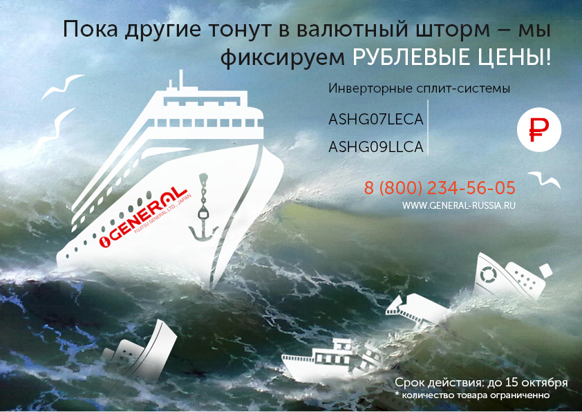 GENERAL фиксирует рублевые цены! Только до 15 октября действуют специальные дилерские цены на инверторные сплит-системы GENERAL серий Energy Plus (ASHG07LECA) и Eco2 Inverter (ASHG09LLCA). Узнать точную стоимость можно по ссылке: www.general-russia.ru/news-255-luchshee_predlozhenie_oseni_ot_general.html. Для доступа к файлу необходимо авторизоваться или зарегистрироваться на сайте. Количество товара ограниченно.