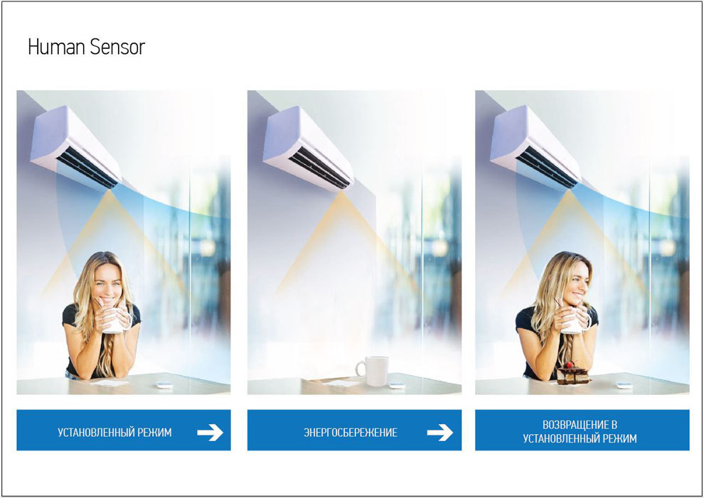 Для снижения энергопотребления в моделях на 3, 6, 4, 9 и 10 кВт установлены датчики движения Human Sensor. При активации функции кондиционер переходит в энергосберегающий режим, когда в помещении нет людей.