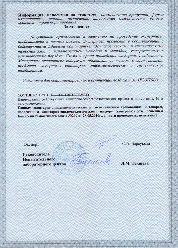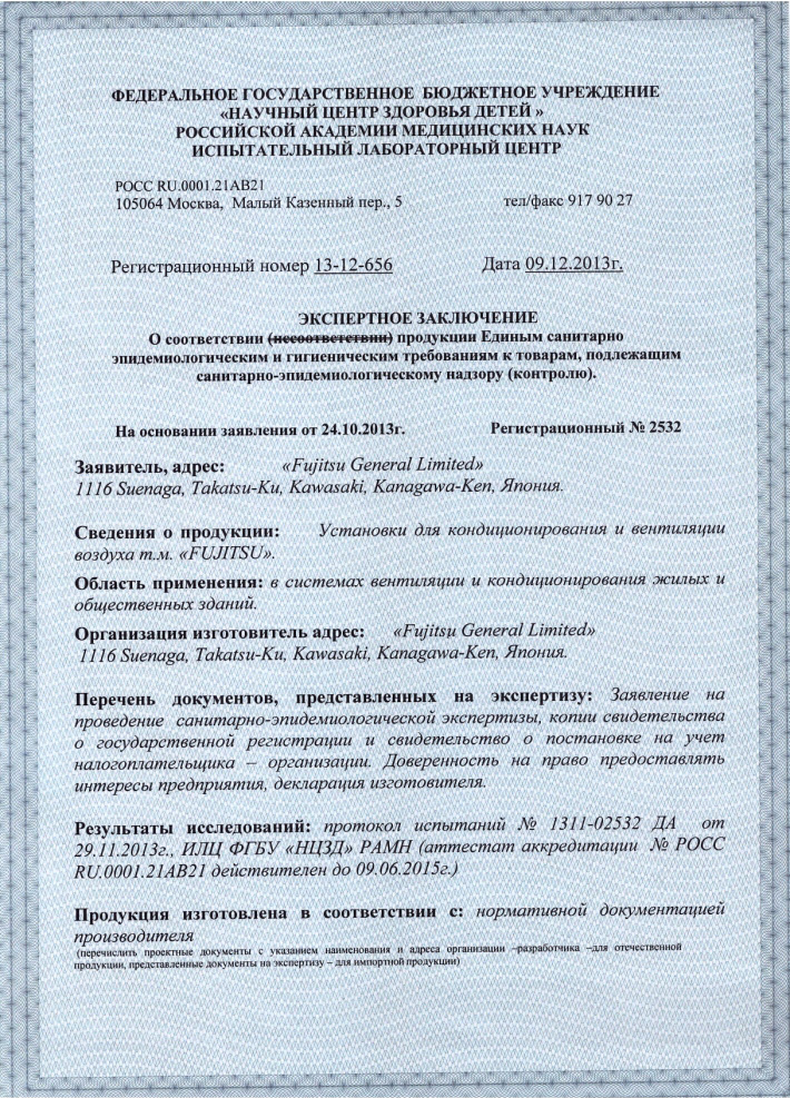 Получено экспертное заключение о соответствии продукции FUJITSU Единым санитарно эпидемиологическим и гигиеническим требованиям к товарам, подлежащим санатарно- эпидемиологическому надзору (контролю).