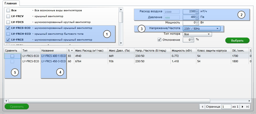 3. Когда параметры заданы, нажимаем кнопку «Выбрать». Программа предложит все вентиляторы, соответствующие заданным требованиям (позиция 4). Далее пользователь может остановить свой выбор на каком-то конкретном вентиляторе или же пометить «галочками» несколько и получить их техническое сравнение (позиция 5).