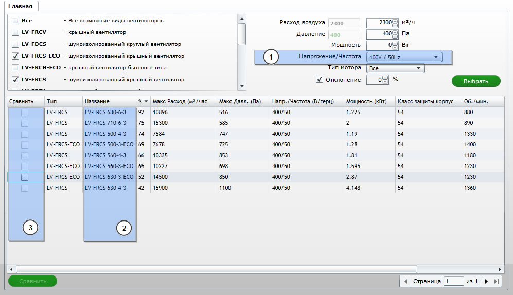 Сначала, выбираем галочками серии вентиляторов — шумоизолированные крышные LV-FRCS ECO и LV-FRCS (позиция 1 на рисунке), а также задаем расход воздуха L=2300 м³/ч и давление 400 Па (позиция 2). В выпадающем меню «Напряжение / Частота» (позиция 3) предлагаются два варианта: однофазные вентиляторы с параметрами «230V/50 Hz» и трехфазные вентиляторы с показателями «400V/50 Hz». Рассмотрим варианты выбора.