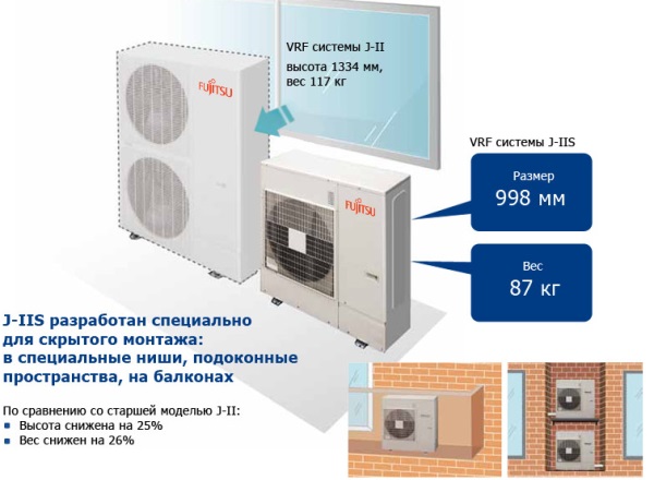 В 2014 году модельный ряд мини-систем VRF Fujitsu расширился за счет трех новых моделей наружных блоков с одним вентилятором. Производительность наружных блоков составляет от 12,1 до 15,1 кВт. Максимальное количество подключаемых внутренних блоков к одному наружному– 8 шт. Яркая черта, выделяющая новые блоки серии J-IIS на фоне конкурентов, — компактные размеры. Таким образом, новые мини-системы VRF сочетают высокую эффективность серии J и удобство монтажа наружных блоков бытовых и полу-промышленных кондиционеров.