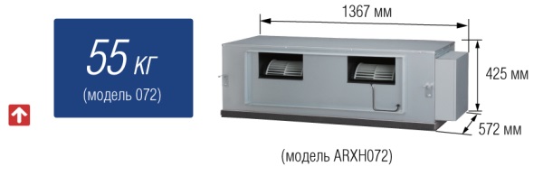 У блока ARXH072GTAH производительностью 22 кВт – самые компактные размеры (425 мм в высоту) и самый легкий вес в классе (55 кг). Прямоточный канальный блок легко монтировать даже в условиях узкого установочного пространства.
