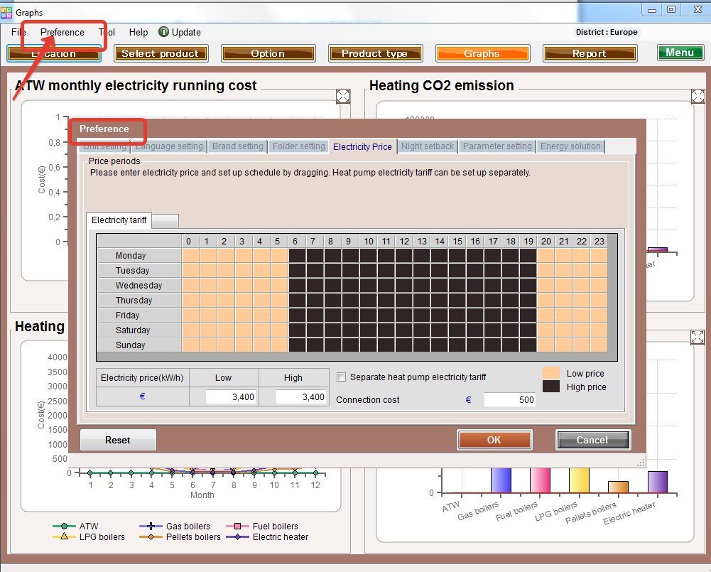 Во вкладке Preference вы можете задать стоимость электроэнергии, характеристики альтернативных систем отопления. После чего программа автоматически произведет расчет выбросов СО2, помесячный расчет стоимости электроэнергии при отоплении тепловым насосом, помесячный и годовой расчет стоимости тепловой энергии в сравнении с другими способами отопления.