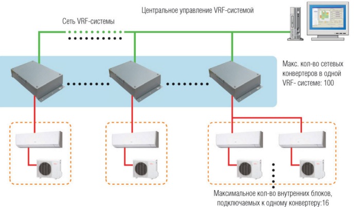 Принципиальная разница между двумя новинками заключается и в том, что к легкому и компактному, UTY-VGTX, не требующему источника электропитания, можно подключить только один индивидуальный проводной пульт, а к UTY-VGTXV – два, и ему требуется подключение к источнику электропитания 220В. Максимальное количество подключаемых внутренних блоков к любому из этих двух конвертеров - 16. Управление включением и выключением блоков, выбор режима, установка температуры и скорости вращения вентилятора осуществляются с проводного пульта сплит-системы или центрального пульта управления VRF. Однако необходимо помнить, что все подключенные к одному конвертеру внутренние блоки являются одной группой и настройка режима работы всех блоков группы изменяется с пульта одновременно. Максимальное количество сетевых конвертеров в рамках одной VRF системы - 100.