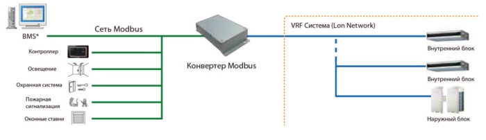 Еще одна новинка, анонсированная компанией Fujitsu General Ltd., - Modbus-конвертер UTY-VMGX. В отличие от модели FJ-RC-MBS-1, который позволял подключать только один внутренний блок или одну группу из внутренних блоков к сети MBS Modbus, конвертер UTY-VMGX подключается непосредственно к межблочной связи VRF-системы и управляет до 128 внутренними блоками. К одной сети управления VRF возможно подключить до 9 конверторов UTY-VMGX.
