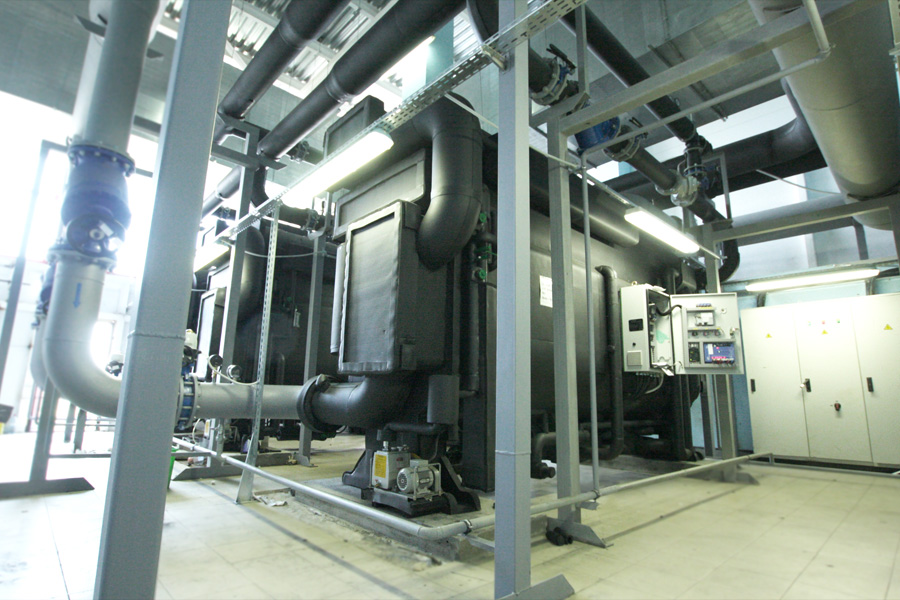 Выбор оборудования обусловлен ограниченными возможностями по энергии, а также наличием горячей воды, поступающей после охлаждения газопоршневых машин. В соответствии с этим, использование абсорбционных чиллеров общей холодопроизводительностью 4,5 мВт можно считать оптимальным решением для данного объекта. В итоге для выработки холодильной мощности в 1500 кВт одной холодильной машине требуется всего 3,8 кВт электроэнергии!