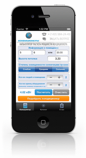 Компания «Кондиционеры» сообщила о выходе нового приложения для iPhone и iPad для расчета мощности кондиционеров и их быстрого подбора. Данное приложение будет интересно не только покупателю, но и менеджеру по продажам — быстро рассчитает, быстро подберет. Приложение бесплатное. Программа предназначена для русскоязычных пользователей. Доступно для скачивания в iTunes, по ссылке: https://itunes.apple.com/ru/app/id629463461.