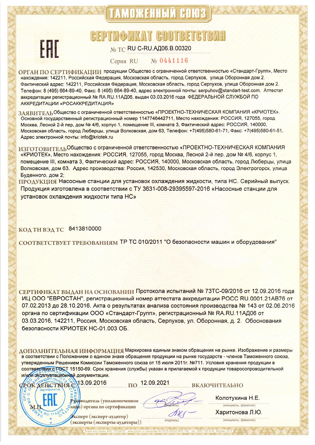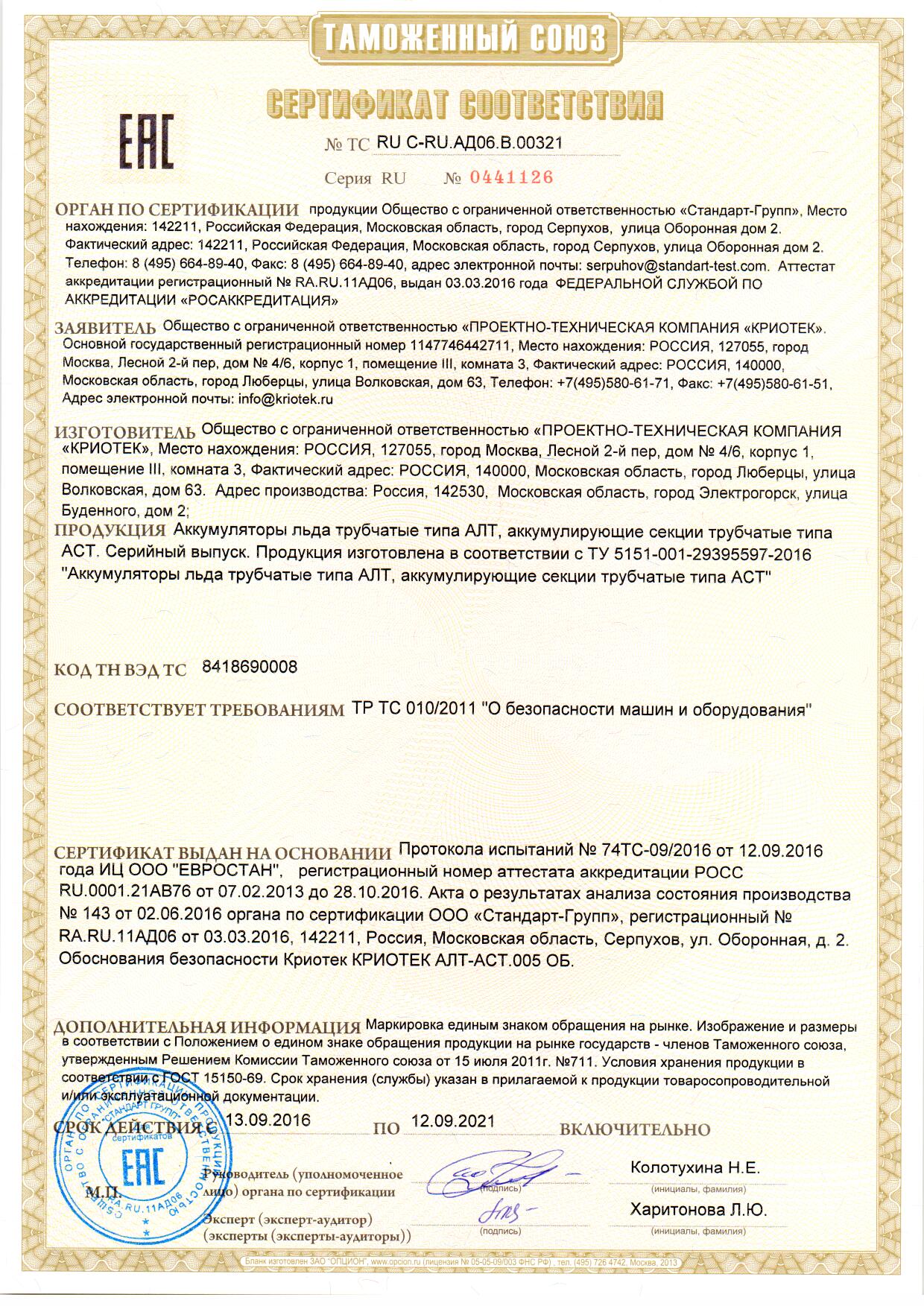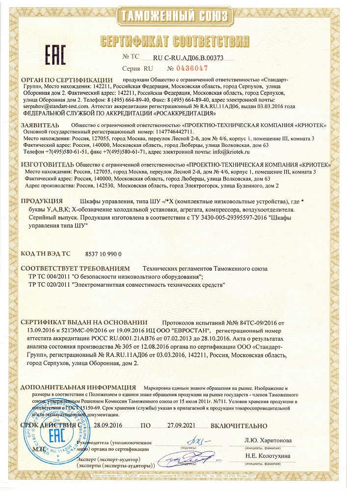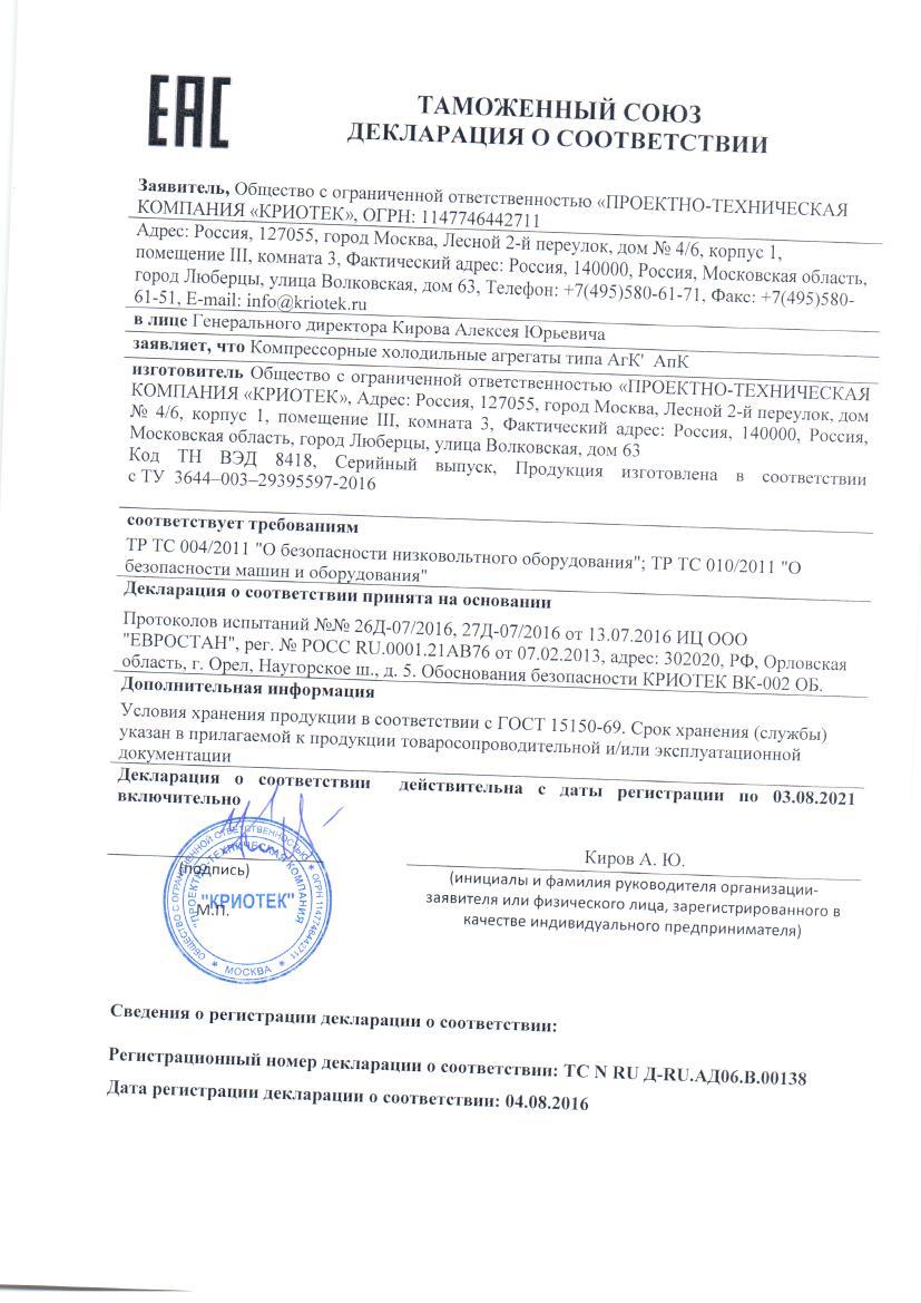 Декларация о соответствии Таможенного союза на компрессорные холодильные агрегаты Криотек
