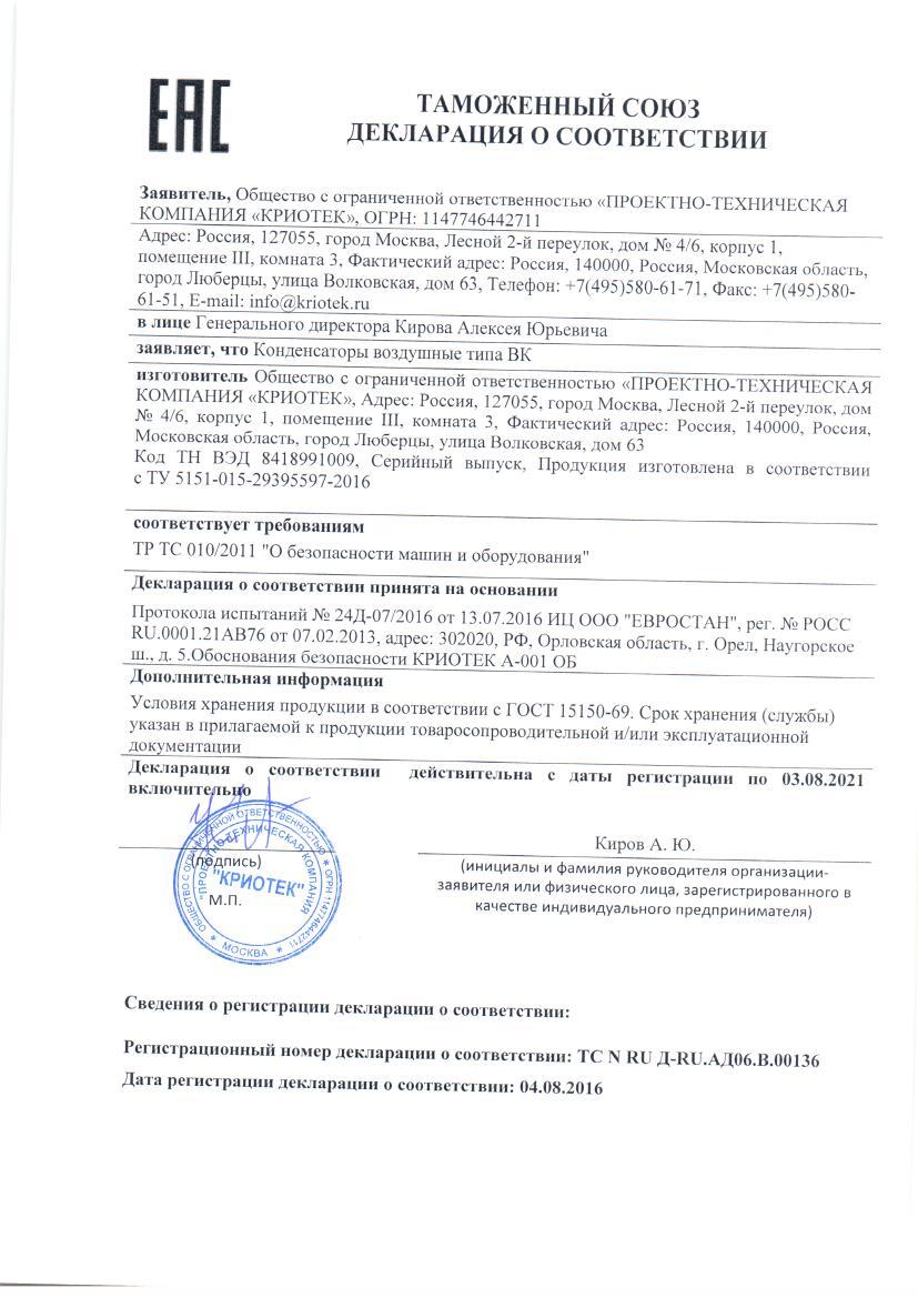 Декларация о соответствии Таможенного союза на конденсаторы воздушные Криотек