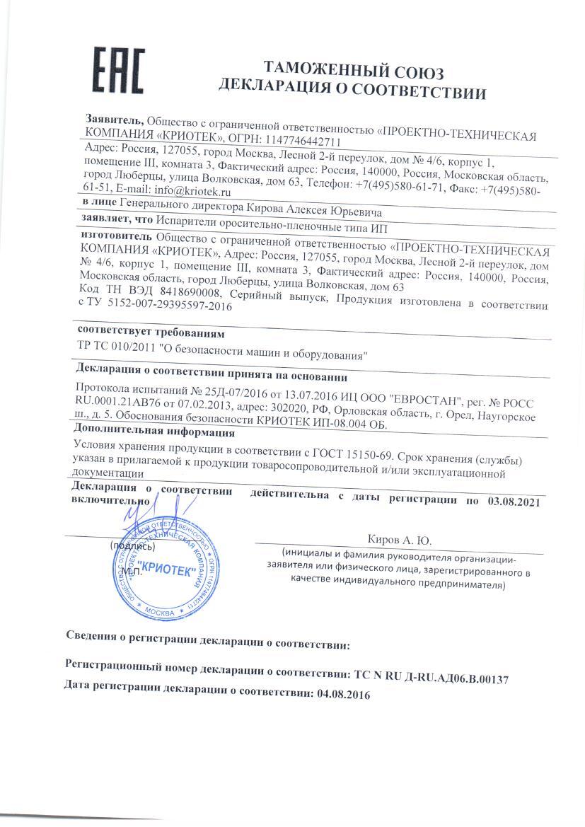 Декларация о соответствии Таможенного союза на испарители оросительно-пленочные Криотек