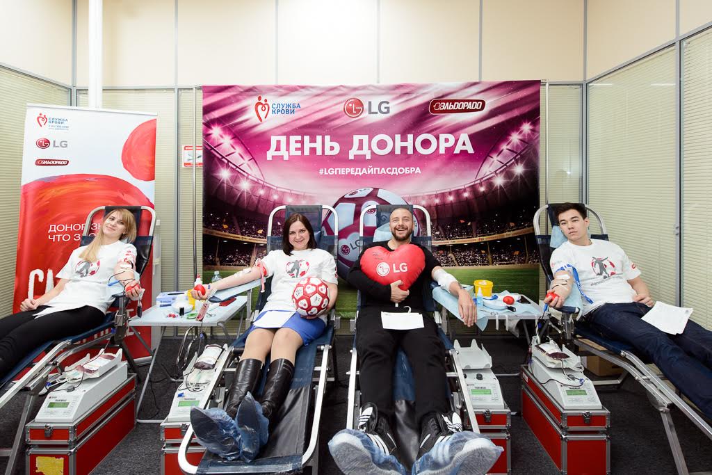 Расширяя донорскую географию, LG проведет футбольные дни донора также в других регионах. Компания LG является первым среди бизнес-сообщества партнером Министерства здравоохранения Российской Федерации и ФМБА России и с 2009 года реализует проект «Корпоративное волонтерство. Содействие донорскому движению по имя здоровья нации» в поддержку Программы развития массового добровольного донорства крови и ее компонентов в России. Компания «Эльдорадо» первой в 2011 году присоединилась к донорским инициативам LG. На протяжении этих лет партнеры совместно реализуют как разовые акции, так и межрегиональные донорские марафоны, передвигаясь на различных видах транспорта и постоянно расширяя географию донорского движения – «Поезд инноваций и добрых дел», корабль «Технология добра», «Воздушный марафон добра», марафон «70 лет Победы». В рамках космических инициатив добра в 2016 году партнеры провели спортивно-космический День донора при поддержке легендарного гимнаста Алексея Немова и Федерации космонавтики России. В эти годы акции двух партнеров поддерживали знаменитые российские спортсмены, такие как Константин Цзю, Алексей Немов, Мария Петрова и Алексей Тихонов, Антон Шипулин, Татьяна Навка, Наталья Рагозина, а в 2016 году – и космонавты при поддержке ОРКК.