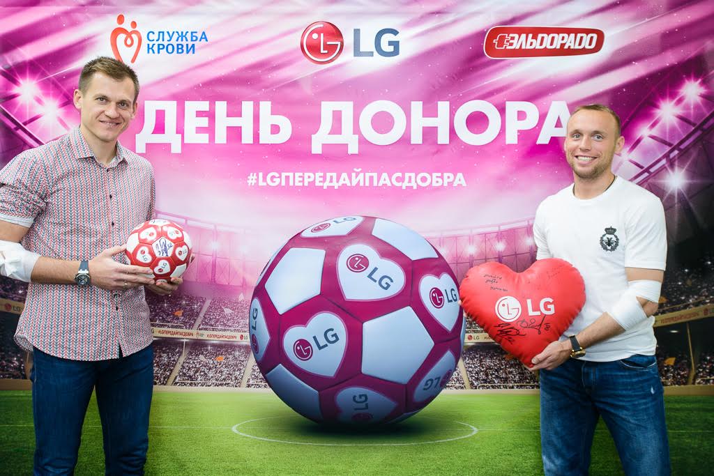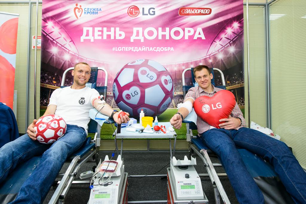 Москва, 17 апреля 2017 г. – В преддверии важных спортивных событий в России LG Electronics и компания Эльдорадо провели 81-й в истории донорского проекта LG и 28-й совместный с партнером футбольный День донора. Акцию поддержали известные спортсмены, российские футболисты – игрок национальной сборной Денис Глушаков, неоднократно лучший футболист месяца Чемпионата России по футболу, и вратарь Артем Ребров, обладатель приза «Вратарь года» имени Льва Яшина. Совместный день донора запустил в России уже шестой марафон в поддержку безвозмездного донорства крови #LGПередайПасДобра, приняв донорскую эстафету из Беларуси, Минска, где проект стартовал в марте при участии футбольной команды «Крумкачы».