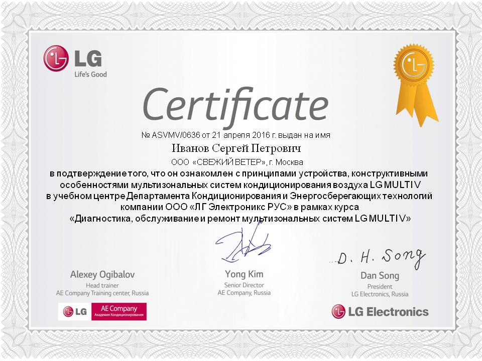 По окончании программы специалисты проходят тестирование на усвоение материала и по результатам проверочных работполучают официальный сертификат,подтверждающий прохождение обучения о принципе устройства, конструктивных особенностях мультизональных систем кондиционирования воздуха LGMULTIV в учебном центре Департамента Кондиционирования и Энергосберегающих технологий компании LGElectronicsв рамках курса «Диагностика, обслуживание и ремонт мультизональных систем LGMULTIV».