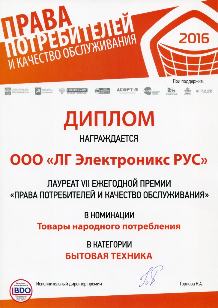 Сервисный департамент компании LG Electronics получил награду в номинации «Товары народного потребления» в категории «Бытовая техника» в рамках подведения итогов VII Ежегодной Премии «Права потребителей и качество обслуживания». Церемония награждения прошла 17 июня 2016 года в Сочи.