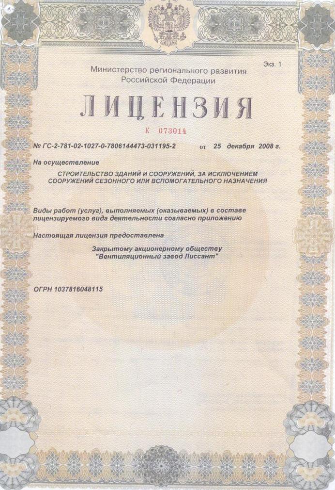 Лицензии и сертификаты компании Лиссант, Вентиляционный завод
