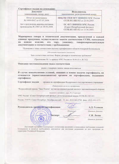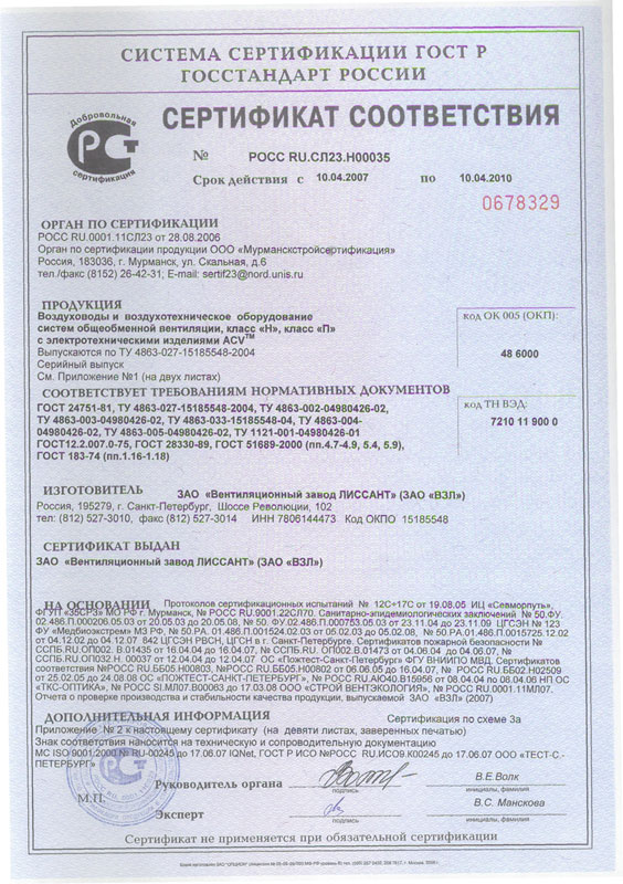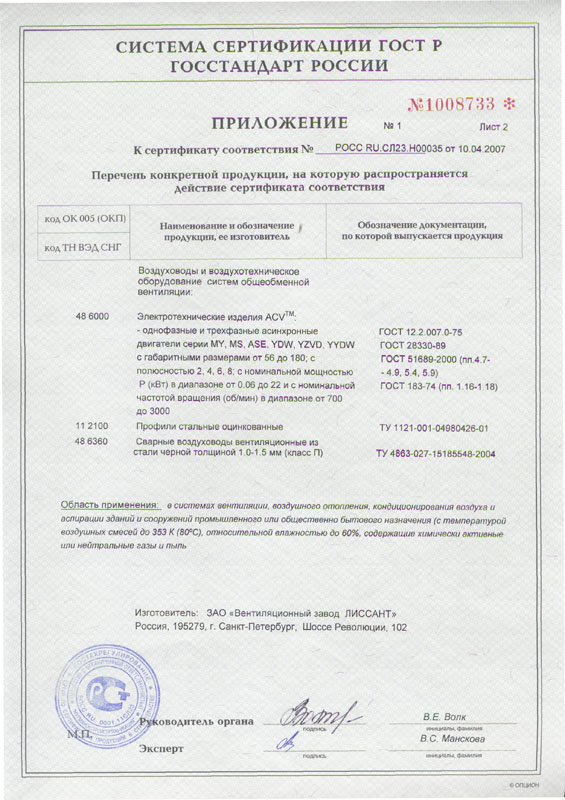- Сертификат соответствия госстандарта России на воздуховоды и воздухотехническое оборудование, прил. 2