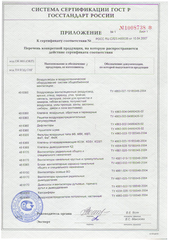 - Сертификат соответствия госстандарта России на воздуховоды и воздухотехническое оборудование, прил. 1